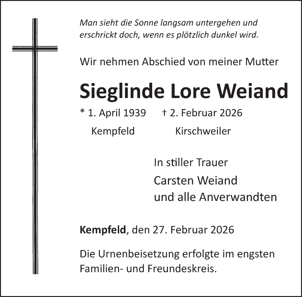 Hier finden Sie alle Traueranzeigen aus der Zeitung, die bisher für Sieglinde Lore Weiand erschienen sind. Weitere Traueranzeigen, die in der Zeitung erscheinen, werden hier ebenfalls aufgelistet