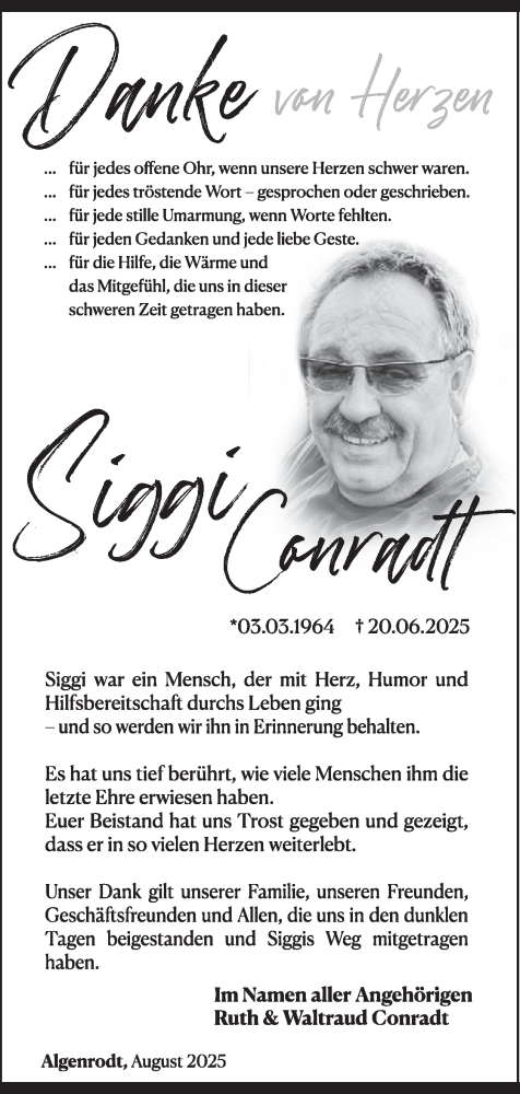 Hier finden Sie alle Traueranzeigen aus der Zeitung, die bisher für Siggi Conradt erschienen sind. Weitere Traueranzeigen, die in der Zeitung erscheinen, werden hier ebenfalls aufgelistet