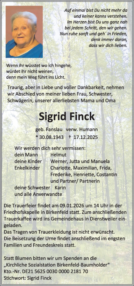 Hier finden Sie alle Traueranzeigen aus der Zeitung, die bisher für Sigrid Finck erschienen sind. Weitere Traueranzeigen, die in der Zeitung erscheinen, werden hier ebenfalls aufgelistet