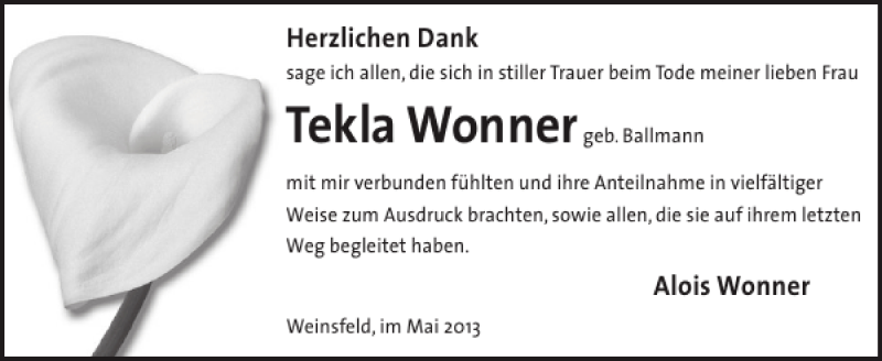 Hier finden Sie alle Traueranzeigen aus der Zeitung, die bisher für Tekla Wonner erschienen sind. Weitere Traueranzeigen, die in der Zeitung erscheinen, werden hier ebenfalls aufgelistet