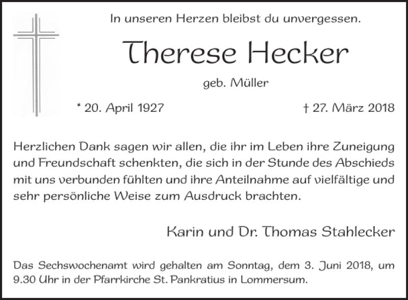 Hier finden Sie alle Traueranzeigen aus der Zeitung, die bisher für Therese Hecker erschienen sind. Weitere Traueranzeigen, die in der Zeitung erscheinen, werden hier ebenfalls aufgelistet
