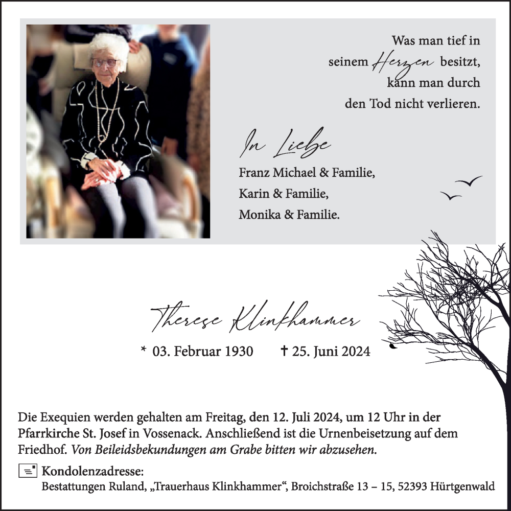 Hier finden Sie alle Traueranzeigen aus der Zeitung, die bisher für Therese Klinkhammer erschienen sind. Weitere Traueranzeigen, die in der Zeitung erscheinen, werden hier ebenfalls aufgelistet