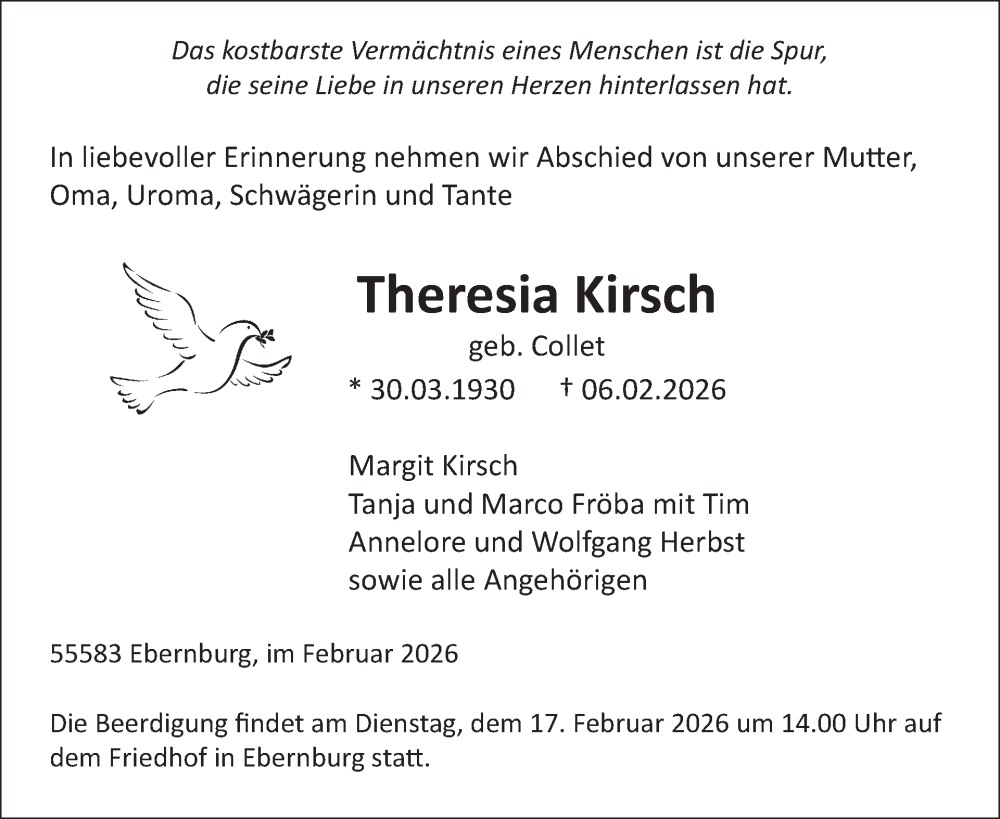 Hier finden Sie alle Traueranzeigen aus der Zeitung, die bisher für Theresia Kirsch erschienen sind. Weitere Traueranzeigen, die in der Zeitung erscheinen, werden hier ebenfalls aufgelistet