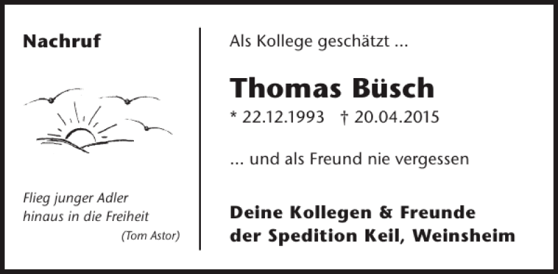 Hier finden Sie alle Traueranzeigen aus der Zeitung, die bisher für Thomas Büsch erschienen sind. Weitere Traueranzeigen, die in der Zeitung erscheinen, werden hier ebenfalls aufgelistet
