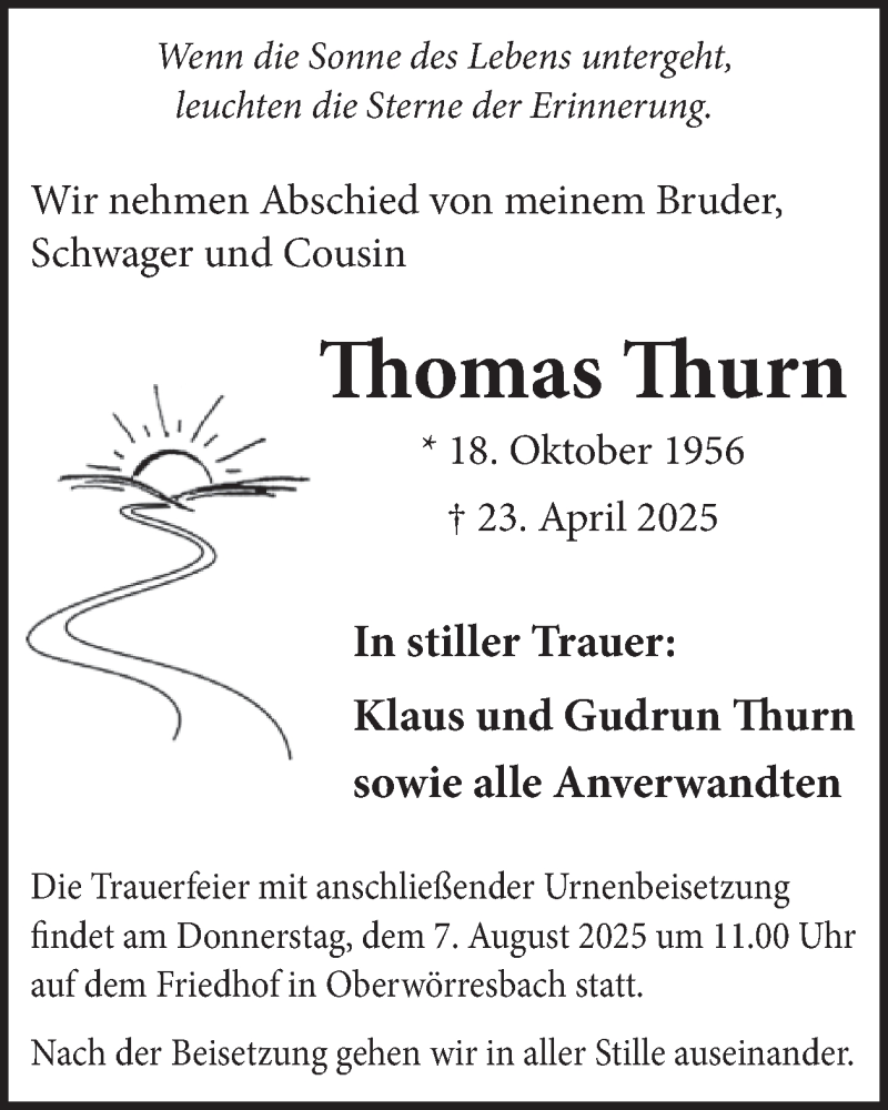 Hier finden Sie alle Traueranzeigen aus der Zeitung, die bisher für Thomas Thurn erschienen sind. Weitere Traueranzeigen, die in der Zeitung erscheinen, werden hier ebenfalls aufgelistet