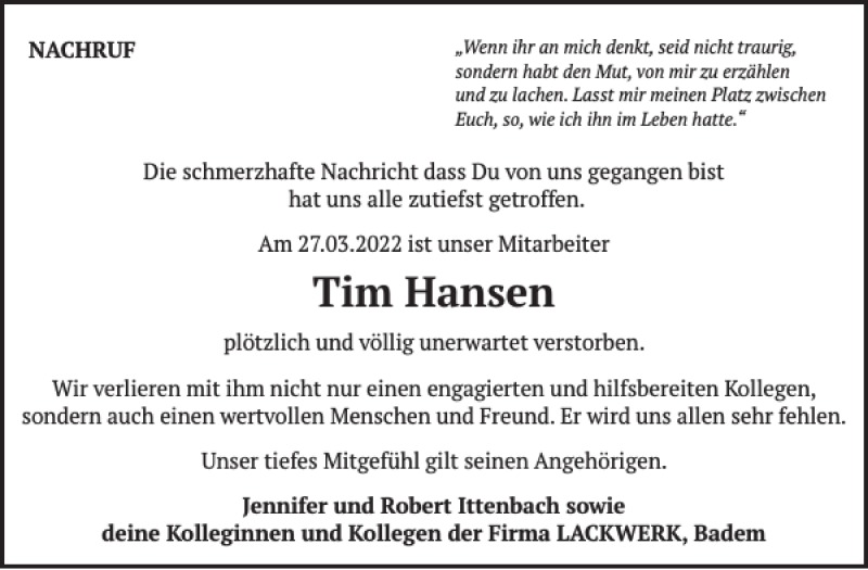 Hier finden Sie alle Traueranzeigen aus der Zeitung, die bisher für Tim Hansen erschienen sind. Weitere Traueranzeigen, die in der Zeitung erscheinen, werden hier ebenfalls aufgelistet