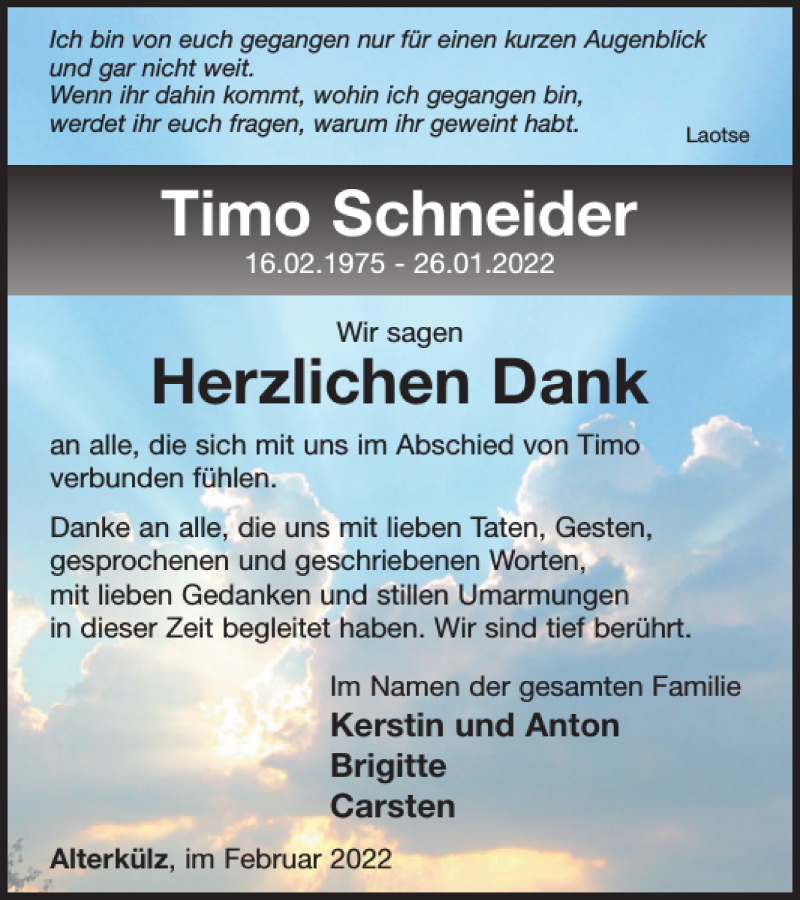 Hier finden Sie alle Traueranzeigen aus der Zeitung, die bisher für Timo Schneider erschienen sind. Weitere Traueranzeigen, die in der Zeitung erscheinen, werden hier ebenfalls aufgelistet