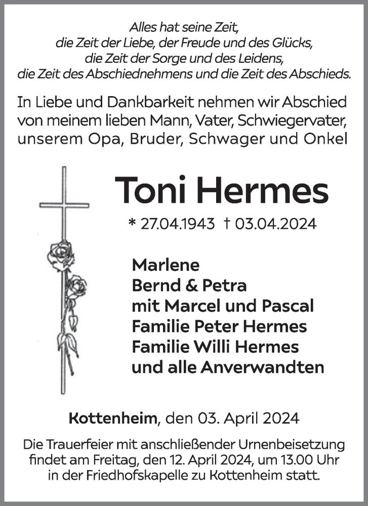 Hier finden Sie alle Traueranzeigen aus der Zeitung, die bisher für Toni Hermes erschienen sind. Weitere Traueranzeigen, die in der Zeitung erscheinen, werden hier ebenfalls aufgelistet