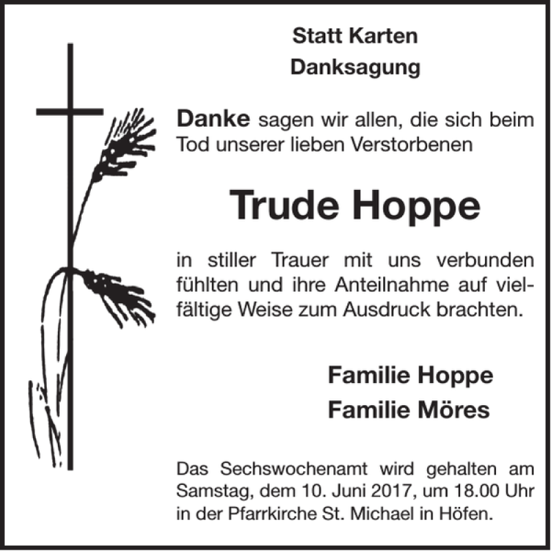 Hier finden Sie alle Traueranzeigen aus der Zeitung, die bisher für Trude Hoppe erschienen sind. Weitere Traueranzeigen, die in der Zeitung erscheinen, werden hier ebenfalls aufgelistet