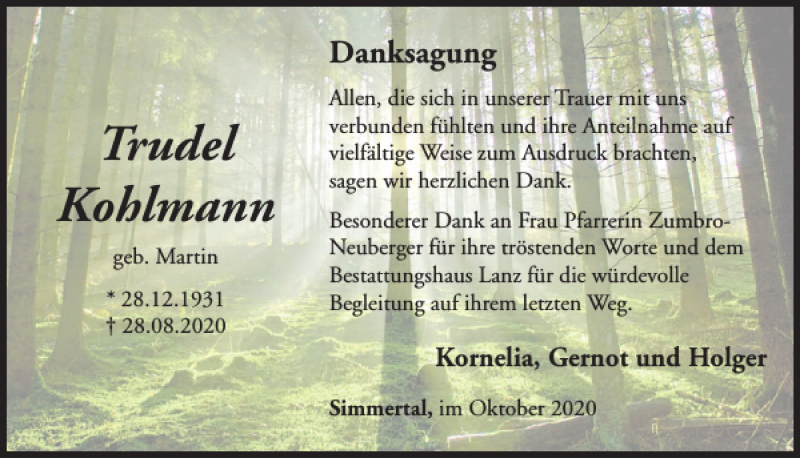 Hier finden Sie alle Traueranzeigen aus der Zeitung, die bisher für Trudel Kohlmann erschienen sind. Weitere Traueranzeigen, die in der Zeitung erscheinen, werden hier ebenfalls aufgelistet
