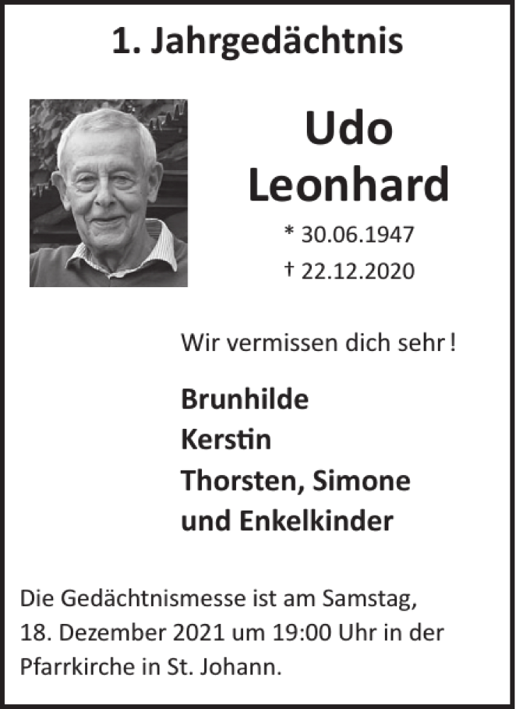 Hier finden Sie alle Traueranzeigen aus der Zeitung, die bisher für Udo Leonhard erschienen sind. Weitere Traueranzeigen, die in der Zeitung erscheinen, werden hier ebenfalls aufgelistet