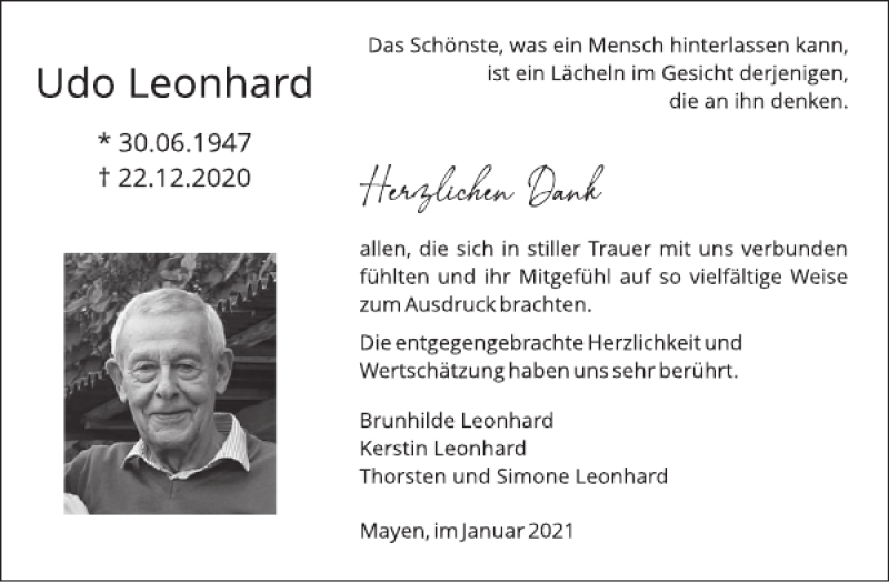 Hier finden Sie alle Traueranzeigen aus der Zeitung, die bisher für Udo Leonhard erschienen sind. Weitere Traueranzeigen, die in der Zeitung erscheinen, werden hier ebenfalls aufgelistet