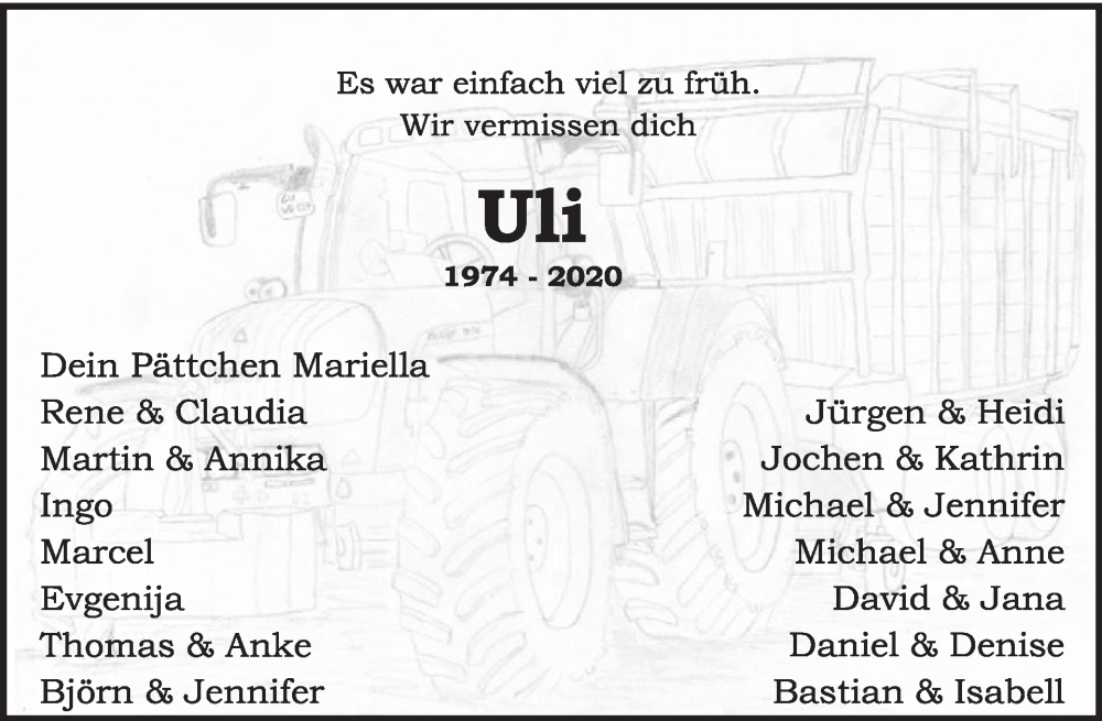 Hier finden Sie alle Traueranzeigen aus der Zeitung, die bisher für Uli erschienen sind. Weitere Traueranzeigen, die in der Zeitung erscheinen, werden hier ebenfalls aufgelistet