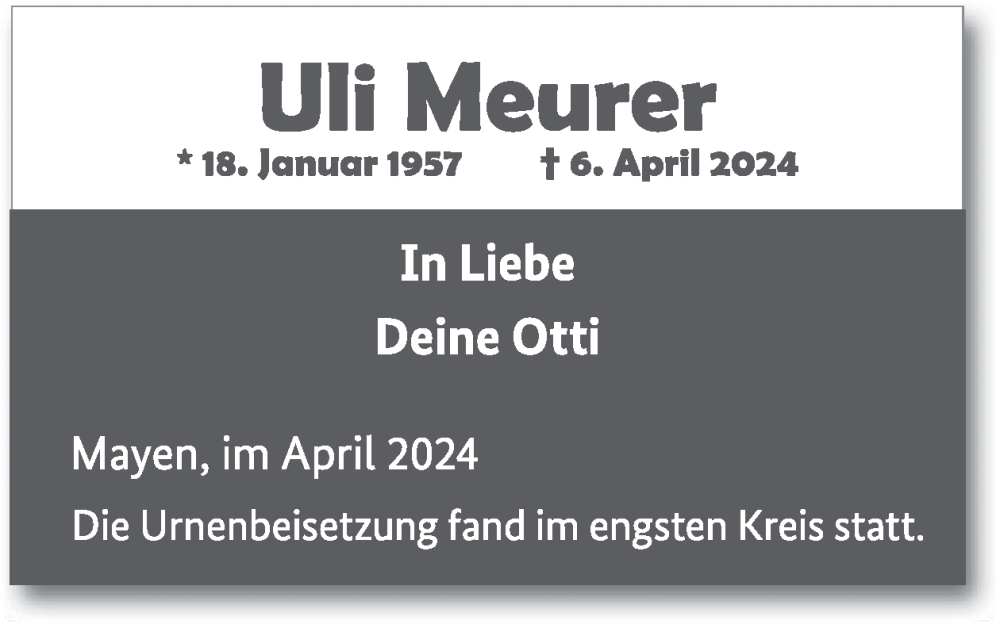 Hier finden Sie alle Traueranzeigen aus der Zeitung, die bisher für Uli Meurer erschienen sind. Weitere Traueranzeigen, die in der Zeitung erscheinen, werden hier ebenfalls aufgelistet