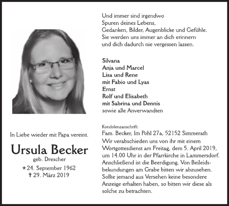 Hier finden Sie alle Traueranzeigen aus der Zeitung, die bisher für Ursula Becker erschienen sind. Weitere Traueranzeigen, die in der Zeitung erscheinen, werden hier ebenfalls aufgelistet