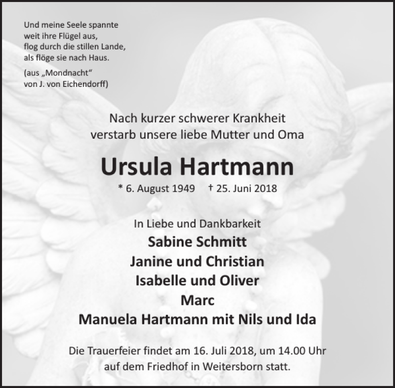 Hier finden Sie alle Traueranzeigen aus der Zeitung, die bisher für Ursula Hartmann erschienen sind. Weitere Traueranzeigen, die in der Zeitung erscheinen, werden hier ebenfalls aufgelistet