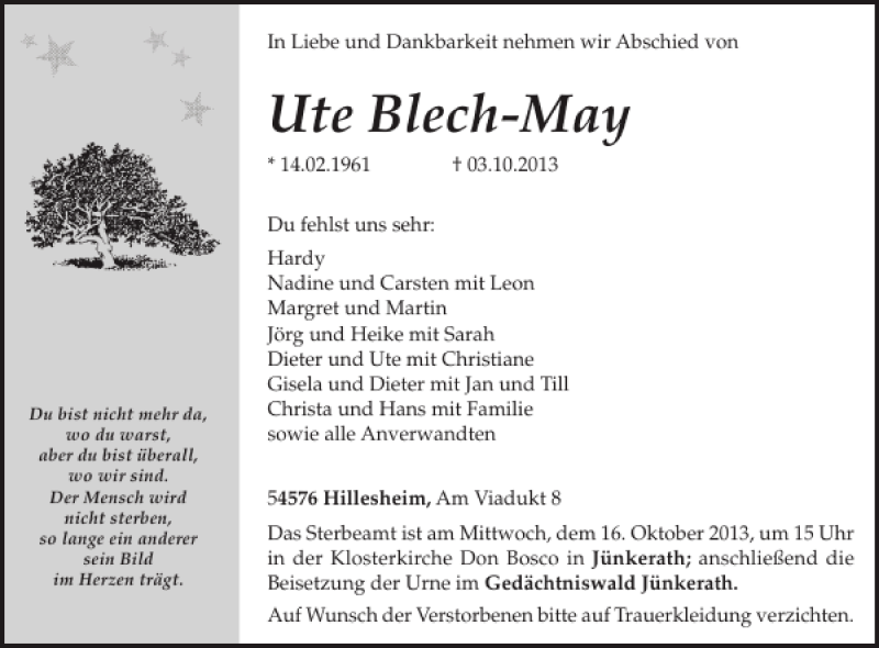 Hier finden Sie alle Traueranzeigen aus der Zeitung, die bisher für Ute Blech-May erschienen sind. Weitere Traueranzeigen, die in der Zeitung erscheinen, werden hier ebenfalls aufgelistet