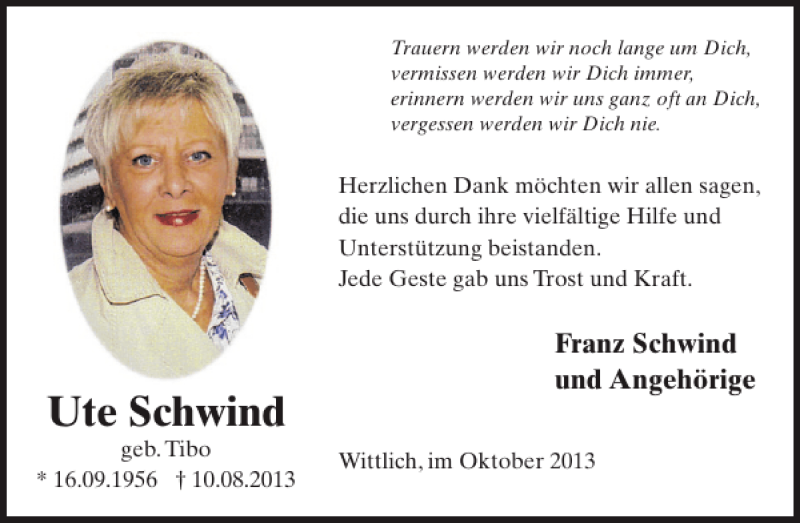 Hier finden Sie alle Traueranzeigen aus der Zeitung, die bisher für Ute Schwind erschienen sind. Weitere Traueranzeigen, die in der Zeitung erscheinen, werden hier ebenfalls aufgelistet