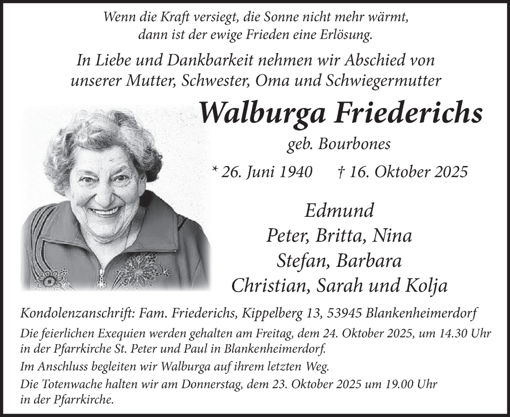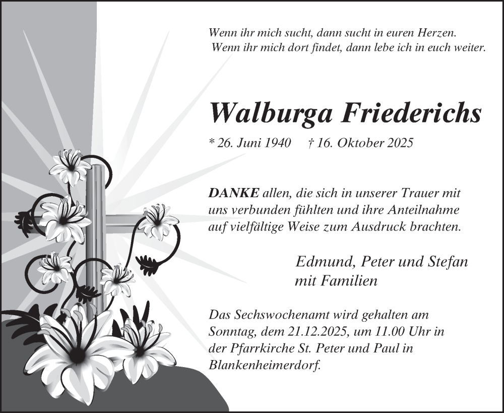 Hier finden Sie alle Traueranzeigen aus der Zeitung, die bisher für Walburga Friederichs erschienen sind. Weitere Traueranzeigen, die in der Zeitung erscheinen, werden hier ebenfalls aufgelistet