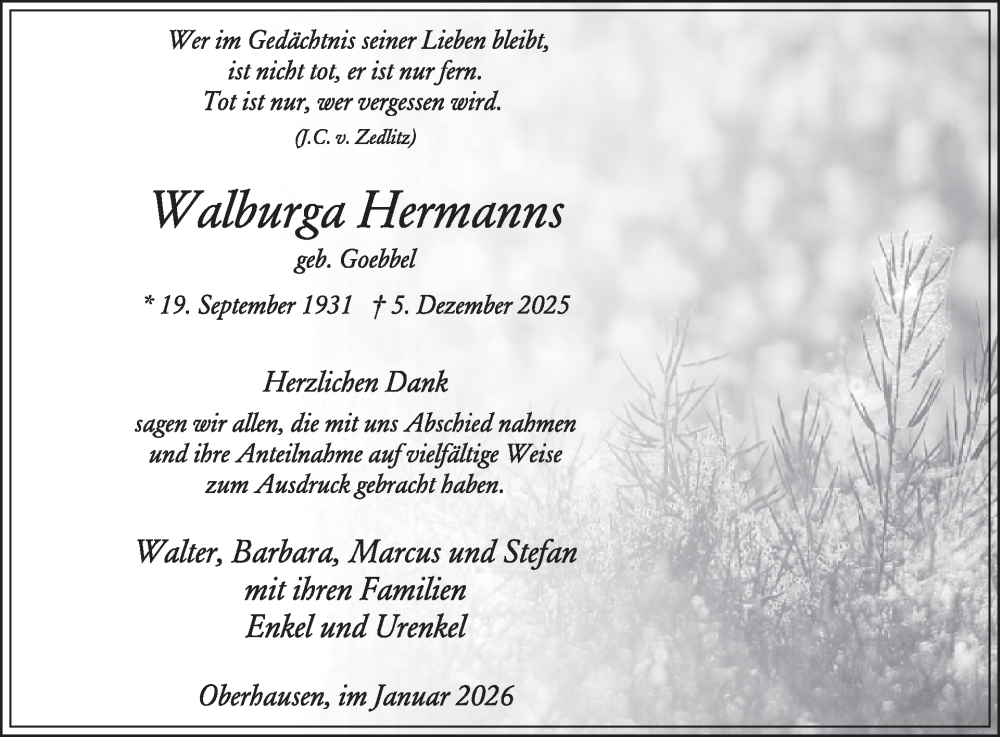 Hier finden Sie alle Traueranzeigen aus der Zeitung, die bisher für Walburga Hermanns erschienen sind. Weitere Traueranzeigen, die in der Zeitung erscheinen, werden hier ebenfalls aufgelistet