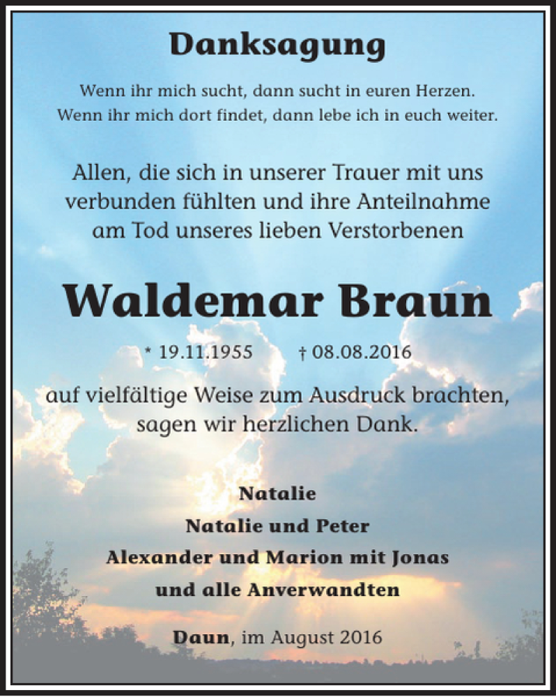 Hier finden Sie alle Traueranzeigen aus der Zeitung, die bisher für Waldemar Braun erschienen sind. Weitere Traueranzeigen, die in der Zeitung erscheinen, werden hier ebenfalls aufgelistet