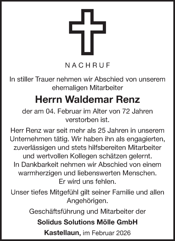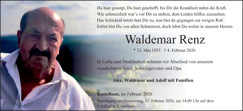 Hier finden Sie alle Traueranzeigen aus der Zeitung, die bisher für Waldemar Renz erschienen sind. Weitere Traueranzeigen, die in der Zeitung erscheinen, werden hier ebenfalls aufgelistet