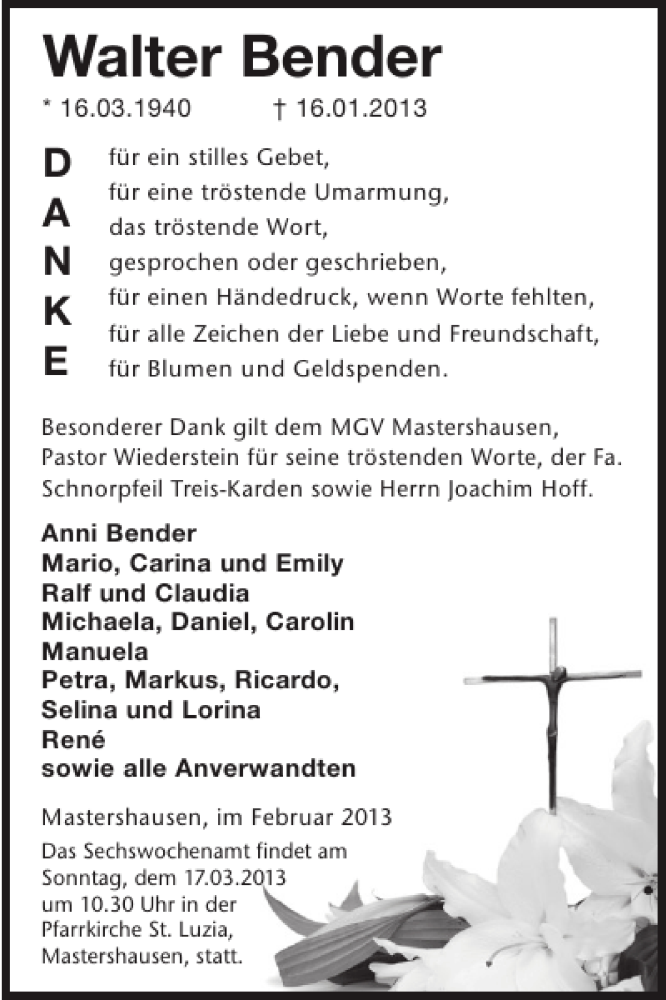 Hier finden Sie alle Traueranzeigen aus der Zeitung, die bisher für Walter Bender erschienen sind. Weitere Traueranzeigen, die in der Zeitung erscheinen, werden hier ebenfalls aufgelistet