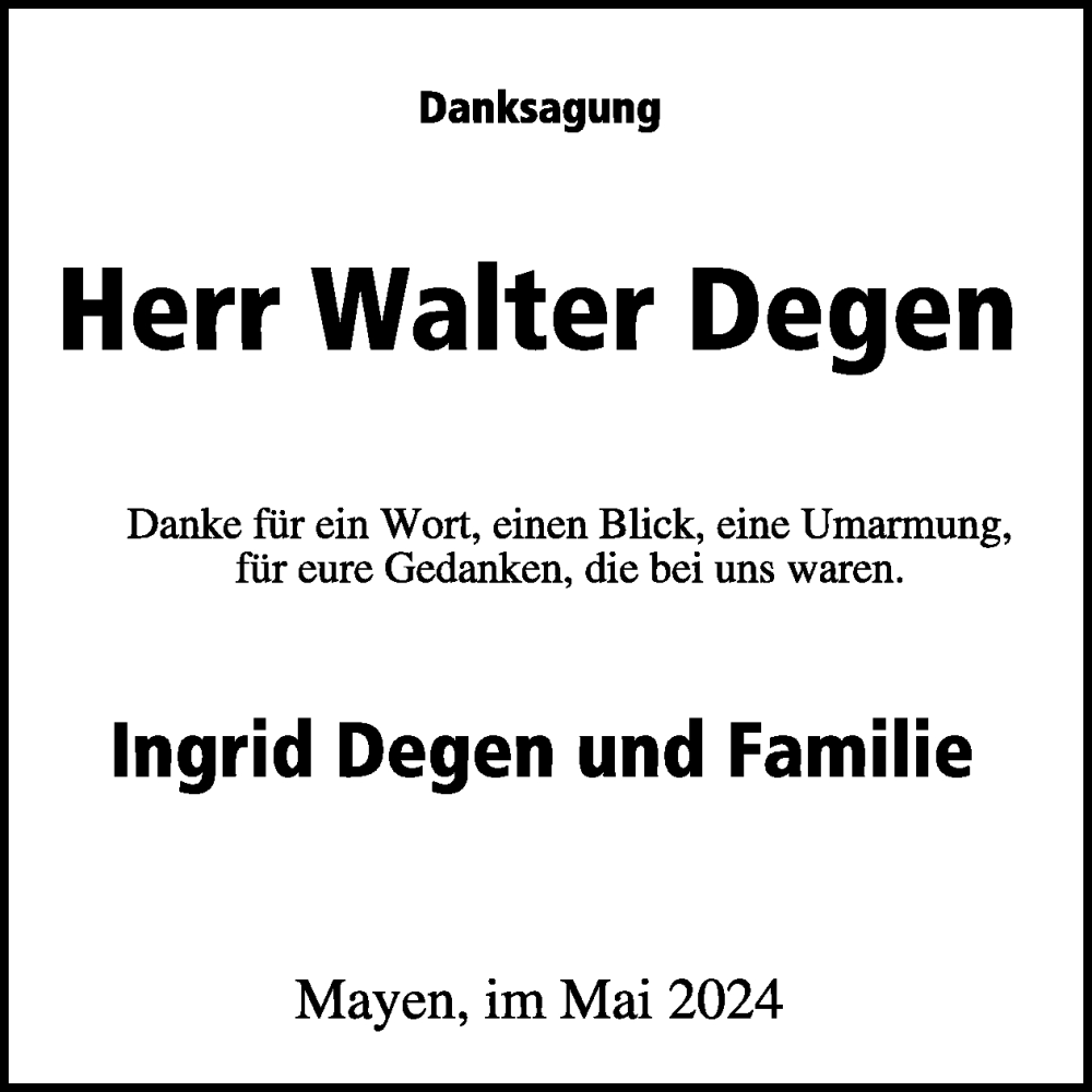 Hier finden Sie alle Traueranzeigen aus der Zeitung, die bisher für Walter Degen erschienen sind. Weitere Traueranzeigen, die in der Zeitung erscheinen, werden hier ebenfalls aufgelistet
