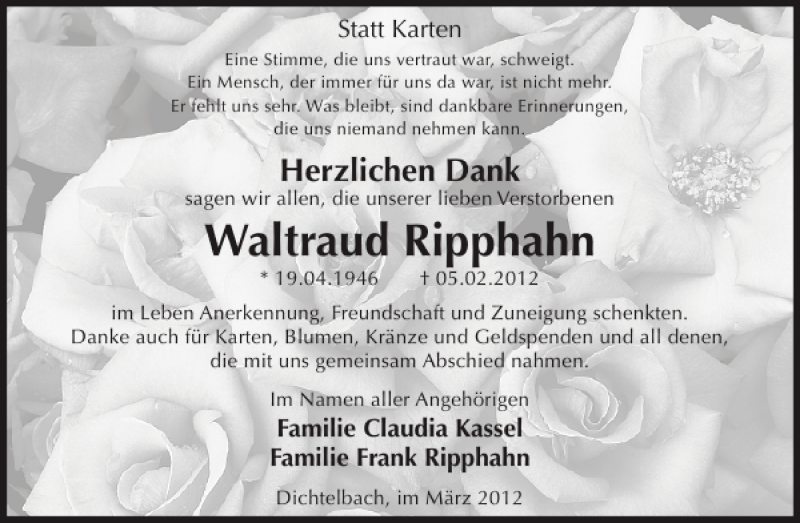 Hier finden Sie alle Traueranzeigen aus der Zeitung, die bisher für Waltraud Ripphahn erschienen sind. Weitere Traueranzeigen, die in der Zeitung erscheinen, werden hier ebenfalls aufgelistet