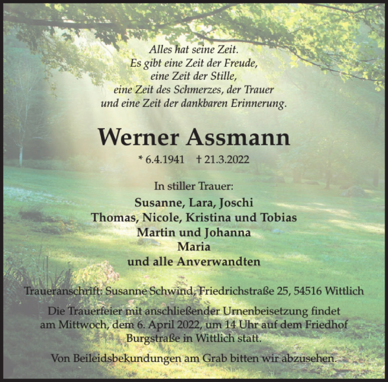 Hier finden Sie alle Traueranzeigen aus der Zeitung, die bisher für Werner Assmann erschienen sind. Weitere Traueranzeigen, die in der Zeitung erscheinen, werden hier ebenfalls aufgelistet