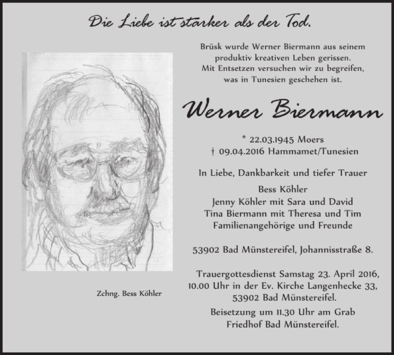 Hier finden Sie alle Traueranzeigen aus der Zeitung, die bisher für Werner Biermann erschienen sind. Weitere Traueranzeigen, die in der Zeitung erscheinen, werden hier ebenfalls aufgelistet