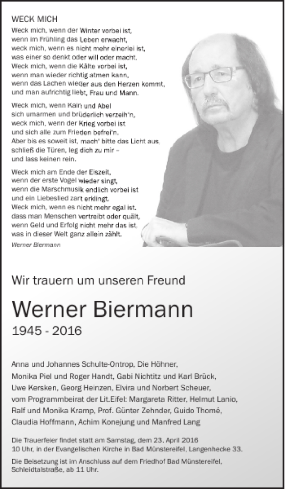 Hier finden Sie alle Traueranzeigen aus der Zeitung, die bisher für Werner Biermann erschienen sind. Weitere Traueranzeigen, die in der Zeitung erscheinen, werden hier ebenfalls aufgelistet