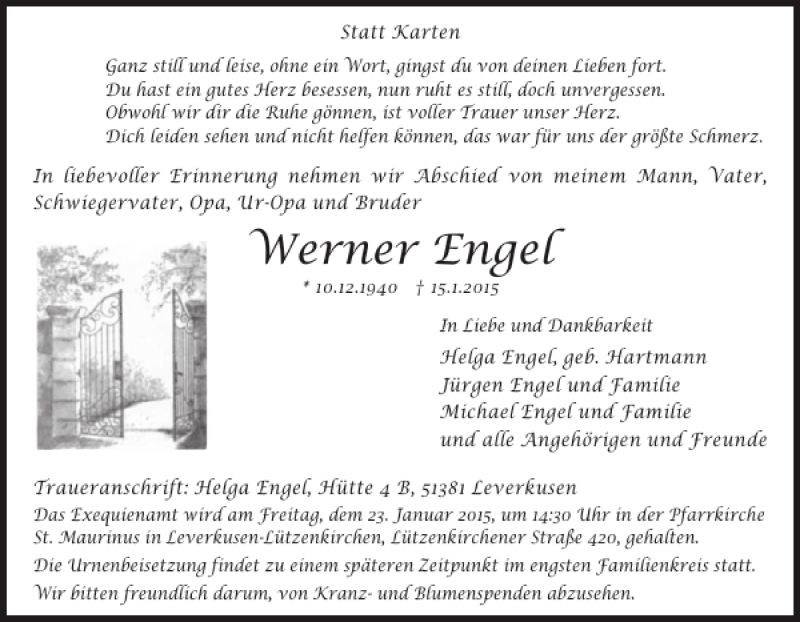 Hier finden Sie alle Traueranzeigen aus der Zeitung, die bisher für Werner Engel erschienen sind. Weitere Traueranzeigen, die in der Zeitung erscheinen, werden hier ebenfalls aufgelistet