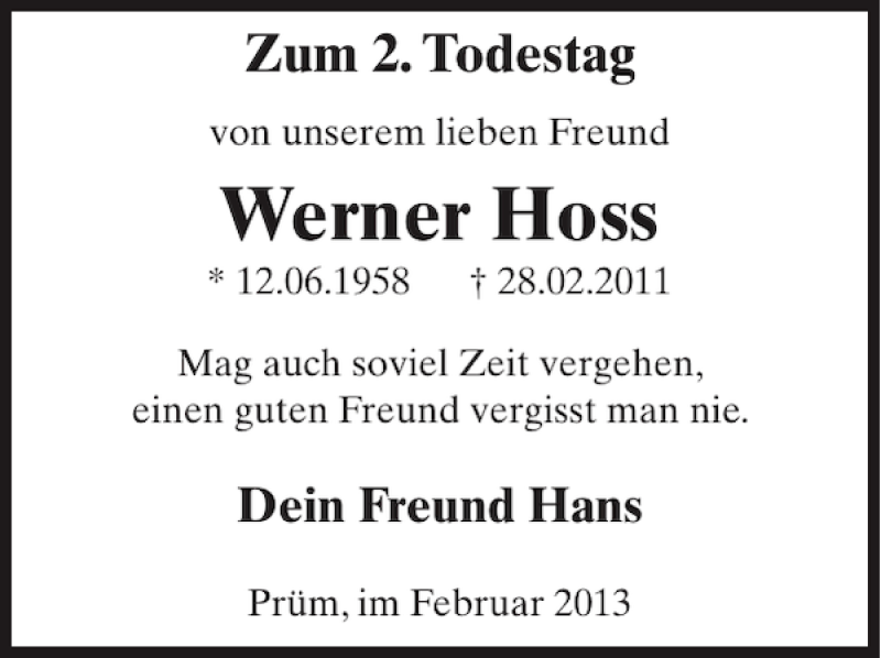Hier finden Sie alle Traueranzeigen aus der Zeitung, die bisher für Werner Hoss erschienen sind. Weitere Traueranzeigen, die in der Zeitung erscheinen, werden hier ebenfalls aufgelistet