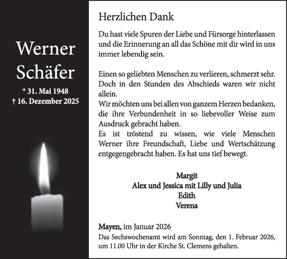 Hier finden Sie alle Traueranzeigen aus der Zeitung, die bisher für Werner Schäfer erschienen sind. Weitere Traueranzeigen, die in der Zeitung erscheinen, werden hier ebenfalls aufgelistet