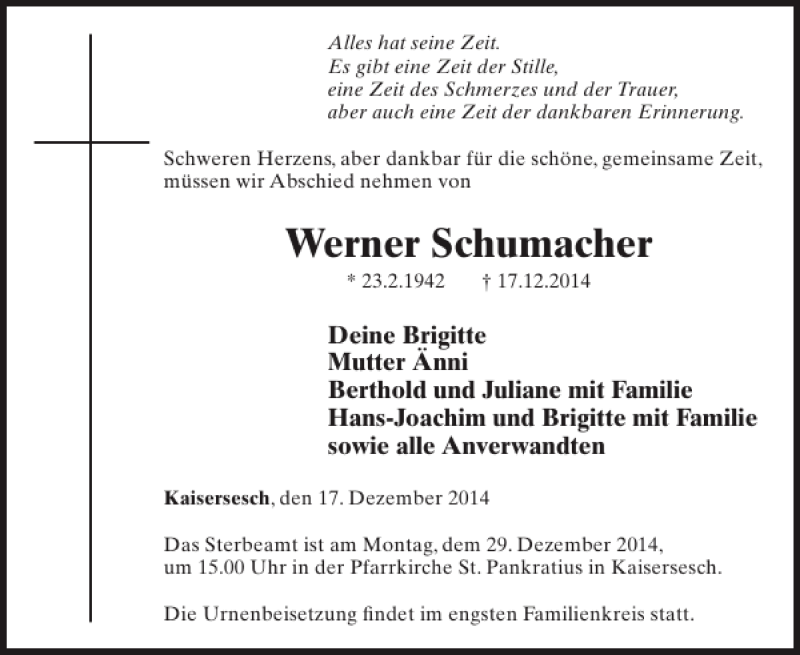Hier finden Sie alle Traueranzeigen aus der Zeitung, die bisher für Werner Schumacher erschienen sind. Weitere Traueranzeigen, die in der Zeitung erscheinen, werden hier ebenfalls aufgelistet