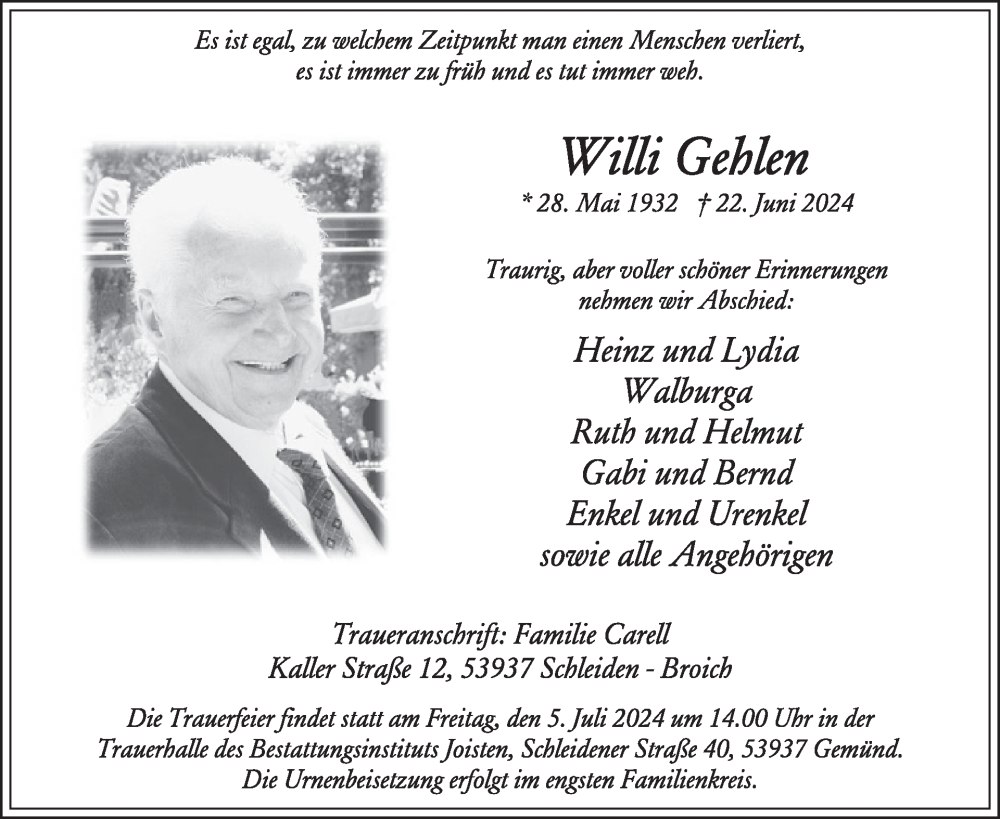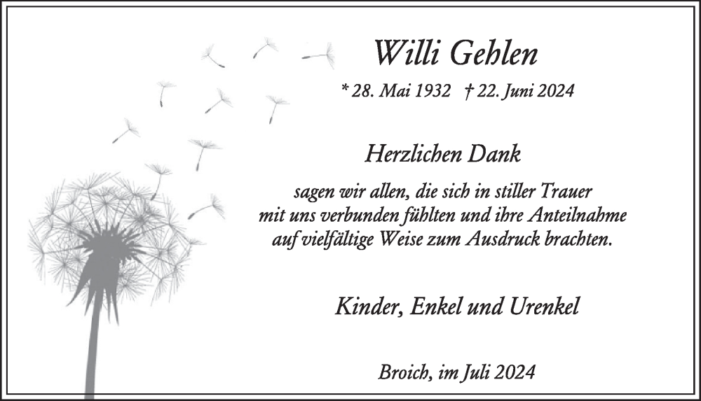Hier finden Sie alle Traueranzeigen aus der Zeitung, die bisher für Willi Gehlen erschienen sind. Weitere Traueranzeigen, die in der Zeitung erscheinen, werden hier ebenfalls aufgelistet
