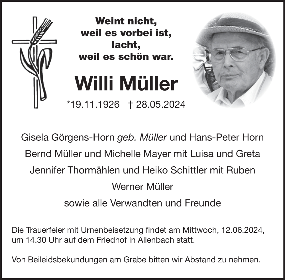 Hier finden Sie alle Traueranzeigen aus der Zeitung, die bisher für Willi Müller erschienen sind. Weitere Traueranzeigen, die in der Zeitung erscheinen, werden hier ebenfalls aufgelistet