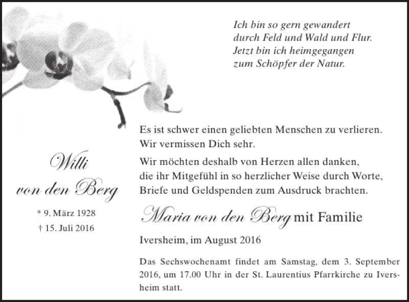 Hier finden Sie alle Traueranzeigen aus der Zeitung, die bisher für Willi von erschienen sind. Weitere Traueranzeigen, die in der Zeitung erscheinen, werden hier ebenfalls aufgelistet