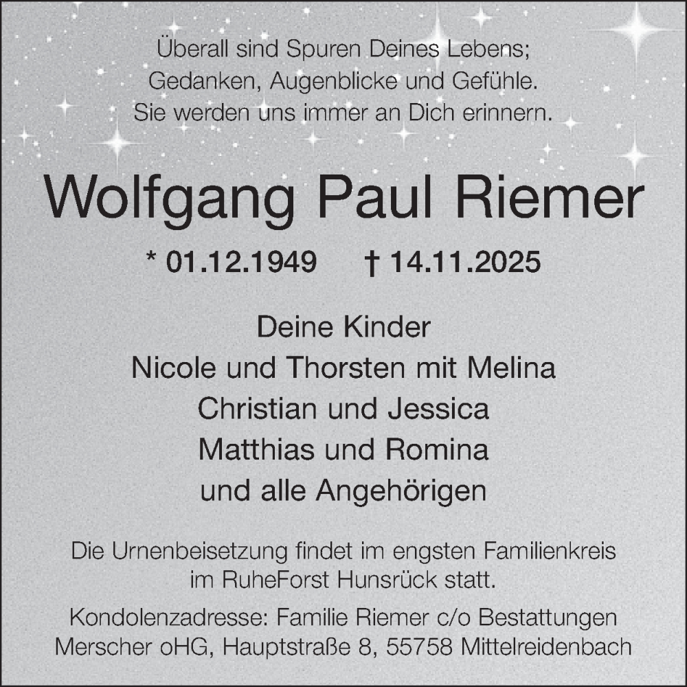 Hier finden Sie alle Traueranzeigen aus der Zeitung, die bisher für Wolfgang Paul Riemer erschienen sind. Weitere Traueranzeigen, die in der Zeitung erscheinen, werden hier ebenfalls aufgelistet